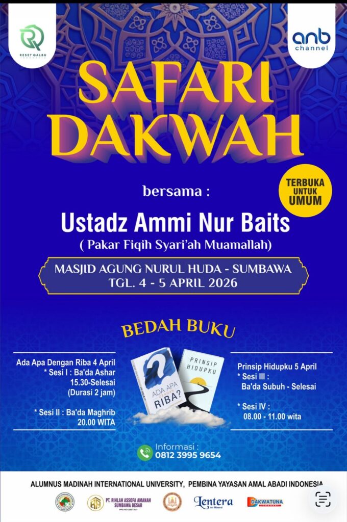 Sebagai ikhtiar merespon keprihatinan tersebut, Yayasan Reset Qalbu, bekerjasama dengan Koperasi Konsumen Syariah BMT Insan Samawa menyelenggarakan Safari Dakwah menghadirkan Pakar Fiqih Muamalah Nasional, Alumnus Madinah International University Ust.Ammi Nur Baits, ST.BA. (ANB) pada tanggal 4-5 April 2026 di Masjid Agung Nurul Huda Sumbawa. Safari Dakwah yang dikemas dengan metode bedah buku Ust.Ammi Nur Baits yang berjudul ‘Ada Apa Dengan Riba’ dan ‘Prinsip Hidupku’.